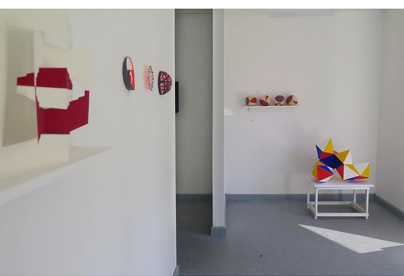 Beth Caspar, edge: joined octahedrons, 2017, painted corrugated cardboard; edge: seamed segments of spheres, 2017, stitched rice paper, each 6 inches in diameter
